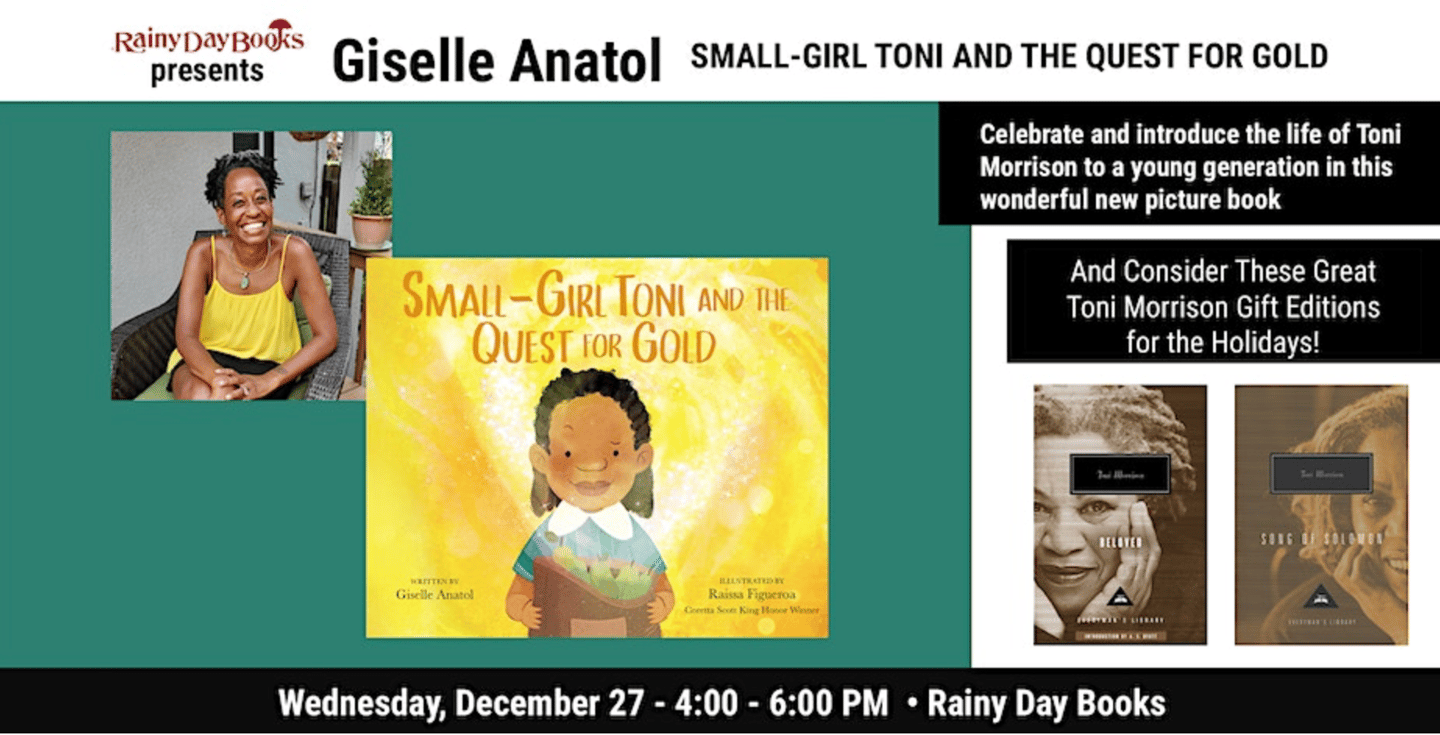 Join Giselle as she presents her new book Small Girl Toni and the Quest for Gold in celebration of the great Toni Morrison's birthday! There will be a reading, book signing, hands-on activity for children, AND CAKE!!